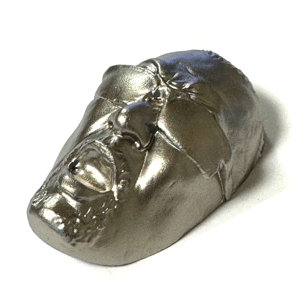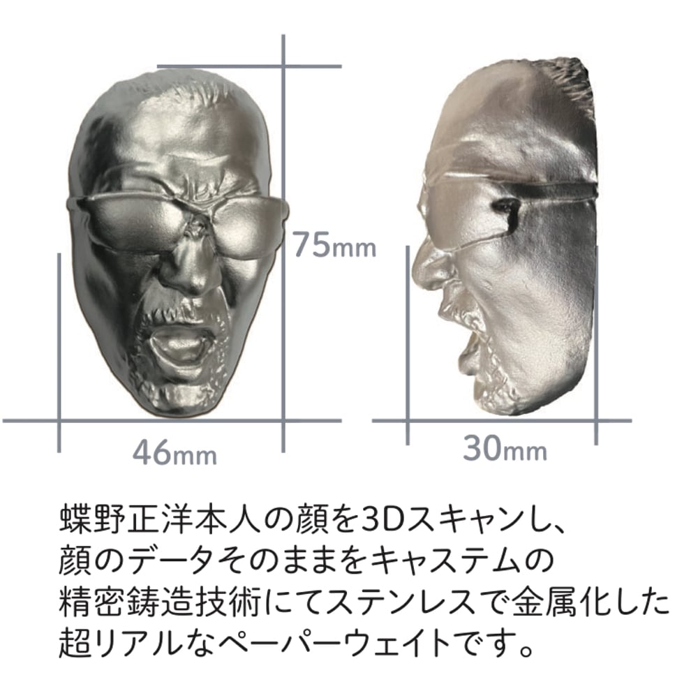蝶野正洋本人の顔を3Dスキャンし、 顔のデータそのままをキャステムの 精密鋳造技術にてステンレスで金属化した 超リアルなペーパーウェイトです。